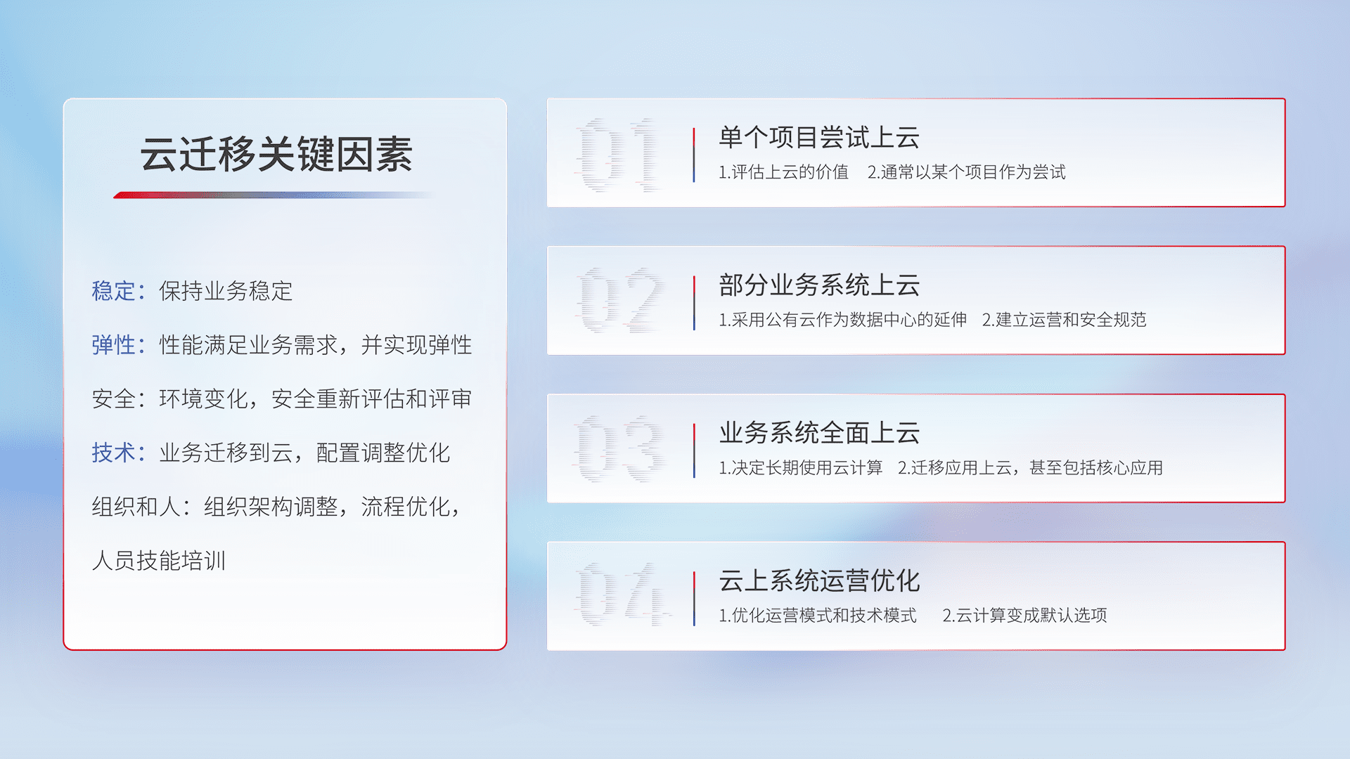 结合实际业务,,,,从规划设计、、、云平台选型、、、、云原生改造、、数据迁移、、集成交付,,迁移全过程为客户识别最佳上云路径,,,做好风险识别管理,,设计网络架构、、、身份权限、、安全审计合规、、、操作审计、、、日志审计、、、监控告警策略、、、多站点容灾设计等,,对云上基础设施进行整体规划,,,提升IT治理水平,,以满足弹性、、、高可用、、、、高性能的需求。。